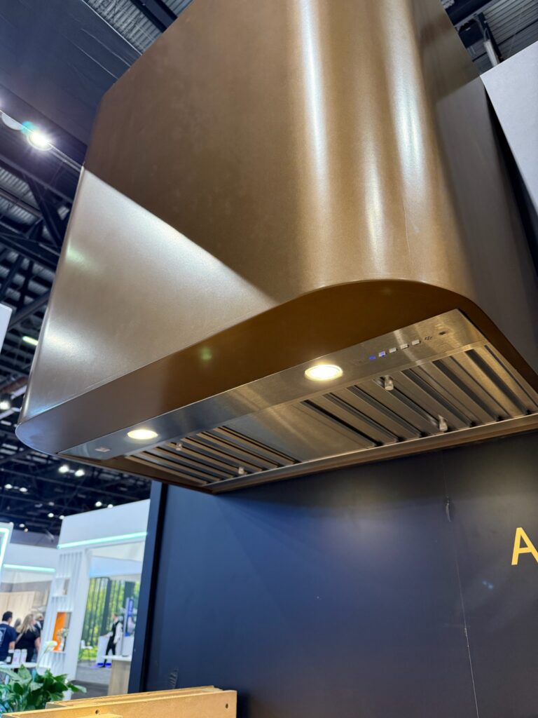 Curves are taking over the kitchen — especially when it comes to range hoods. In addition, we’re seeing a move away from sharp, boxy forms toward softly rounded sides and eased edges that feel far more sculptural. Designers are embracing metal in every way — as a subtle accent or as the main statement, wrapping the hood in rich, expressive finishes. Additionally, designers are introducing leather-wrapped elements, adding an unexpected layer of texture, warmth, and a tailored, furniture-like feel. The range hood has evolved beyond functional ventilation — it now serves as a true focal point and a defining design feature in the kitchen.